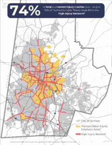 This map indicates that 74 percent of fatal and severe-injury crashes occur on 10 percent of Durham’s Roads. This data was determined by analyzing crash data from eight years (2016-2023) in Durham.